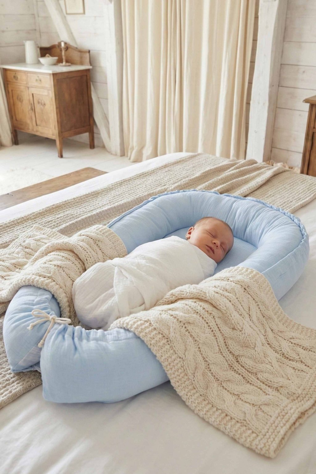Mušelinové hniezdo poskytuje vášmu bábätku pocit bezpečia, blízkosti a pohodlia počas odpočinku či spánku. Vďaka svojmu tvaru a mäkkému okraju sa bábätko cíti útulne a chránené, podobne ako v maminom náručí.