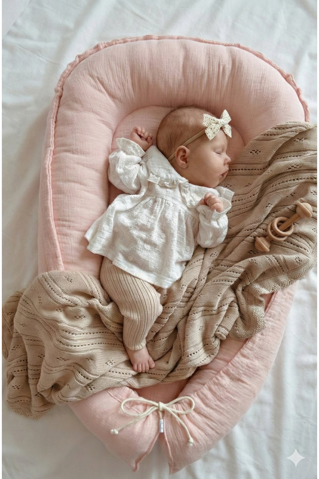 Mušelinové hniezdo poskytuje vášmu bábätku pocit bezpečia, blízkosti a pohodlia počas odpočinku či spánku. Vďaka svojmu tvaru a mäkkému okraju sa bábätko cíti útulne a chránené, podobne ako v maminom náručí.